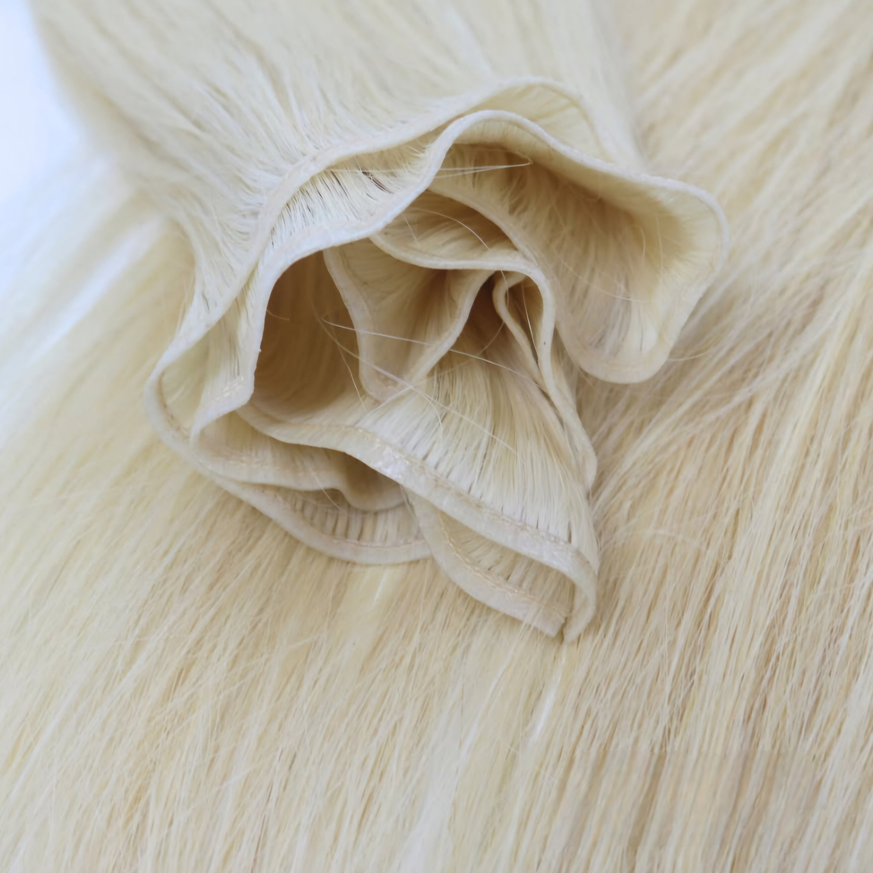Webkante: Die Strähnen sind wie Flügel gefächert vernäht, also die Webkante ist besonders flexibel und luftig, ähnlich wie ein Schmetterlingsflügel.
