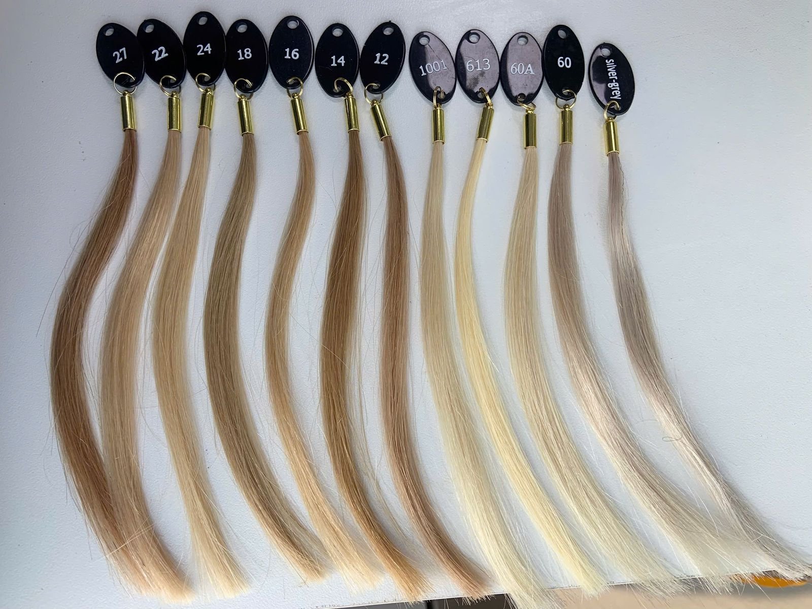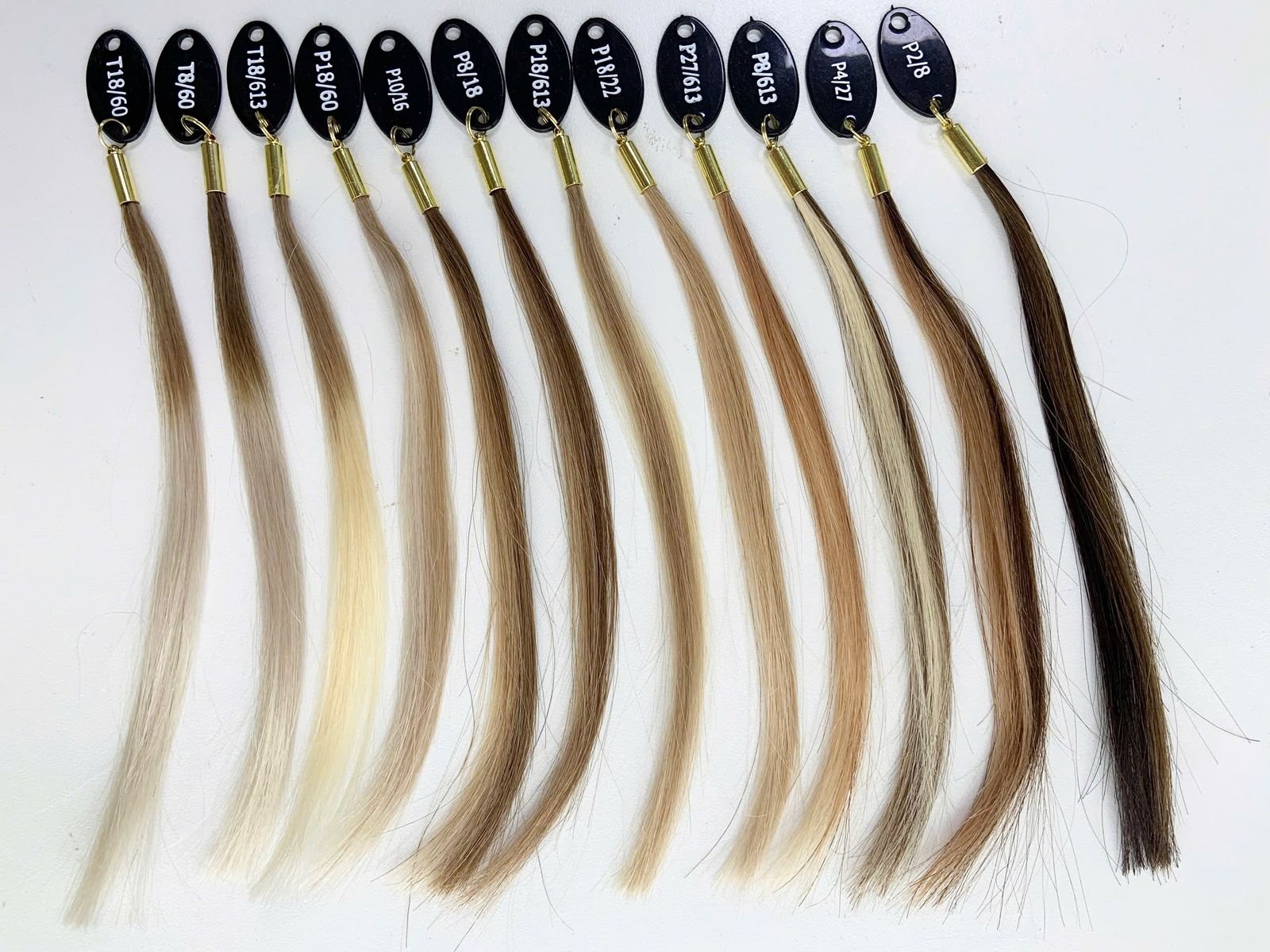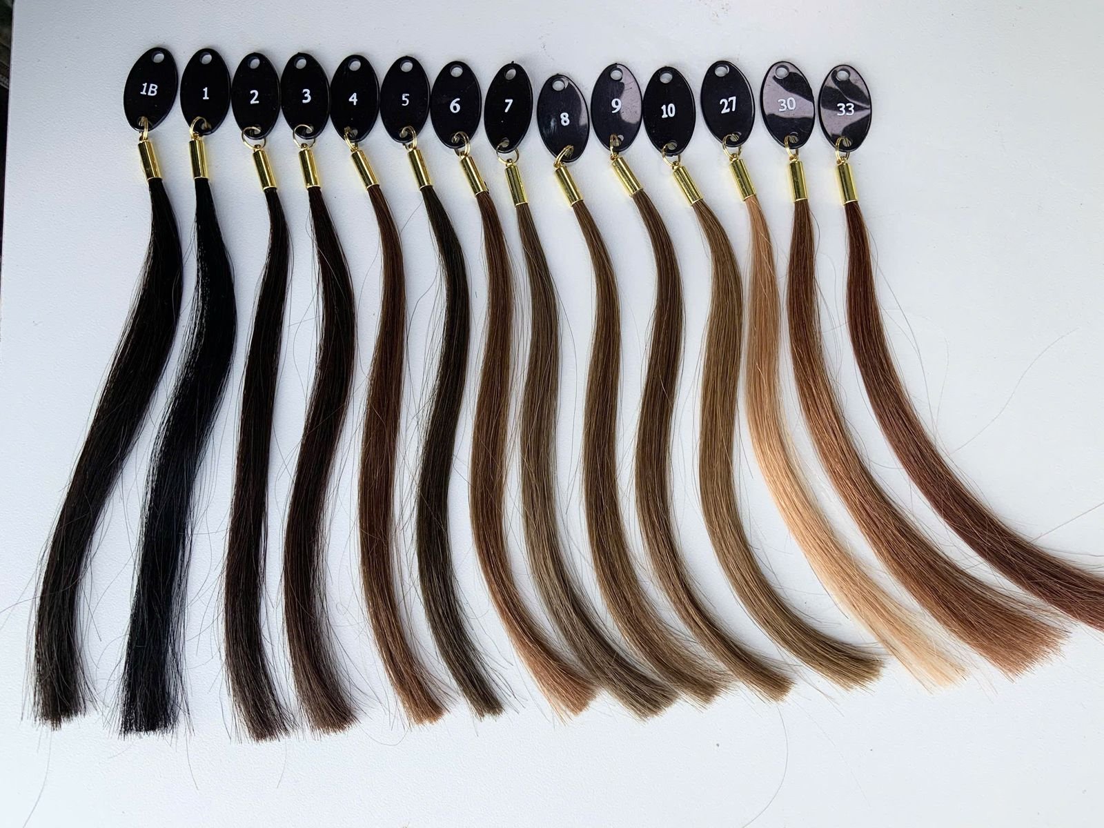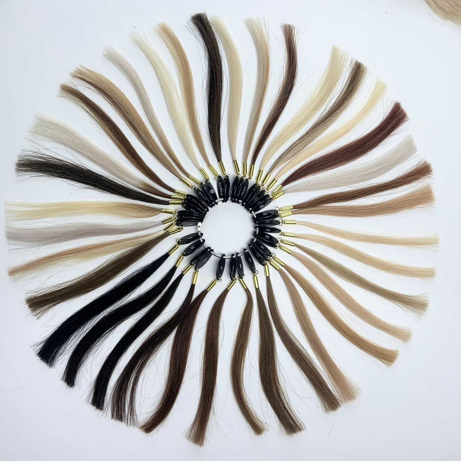 Mit dem professionellen Farbring von EchtHaar Direkt präsentierst du die komplette Farbpalette auf einen Blick: 37 brillante Nuancen, gefertigt aus echten Haarsträhnen. Von strahlenden Blondtönen über natürliche Braunabstufungen bis hin zu kräftigem Schwarz jede Strähne zeigt realistisch, wie unsere Haare in Farbe, Glanz und Struktur wirken.